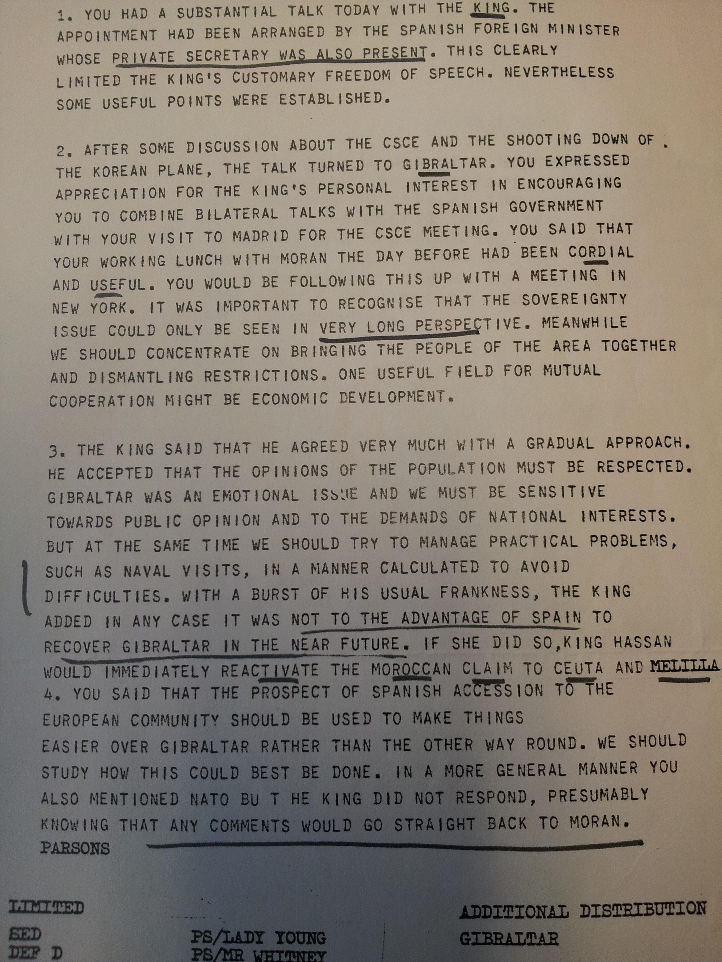 - El Rey enfatizó, como ya lo hizo en otras ocasiones, que lo importante era adoptar medidas con respecto a Gibraltar que apaciguasen a la opinión pública por ahora. Ambos gobiernos deberían comprender claramente en privado que en realidad España no buscaba una solución rápida al problema de la soberanía, puesto que si recuperase Gibraltar, el Rey Hassan de Marruecos activaría inmediatamente su reclamación sobre Ceuta y Melilla. Ambos Ministros de Exteriores deberían llegar a un entendimiento en privado entre ellos, diferenciando claramente entre su objetivo real y los métodos utilizados para propiciar la opinión pública de ambos lados.