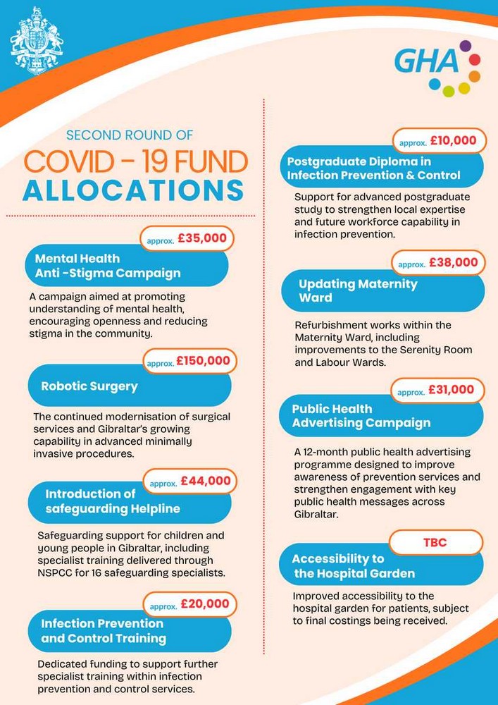 El Fondo fue creado a partir de donaciones de ciudadanos y entidades comerciales durante la pandemia de Covid-19 para apoyar a los servicios sanitarios y asistenciales de Gibraltar. Tal y como se anunciรณ anteriormente, despuรฉs de la primera ronda de financiaciรณn en enero de 2025 fueron asignadas cerca de 585.000 libras a una serie de proyectos que incluรญan mejoras en la accesibilidad de los hospitales, nuevos equipos mรฉdicos, campaรฑas de salud comunitaria y formaciรณn sanitaria especializada.