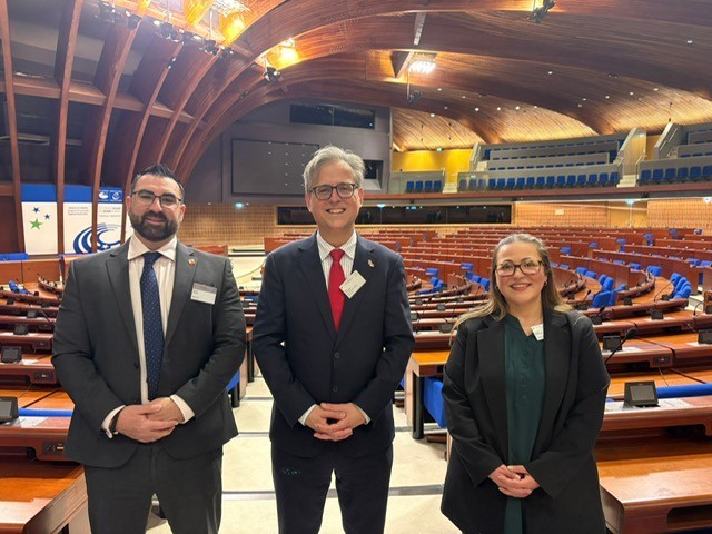 Feetham, en el centro, con Annette Perales (National Coordinator Delegate, MONEYVAL) y Nicholas Peliza (del Ministerio de Justicia), en Estrasburgo -2