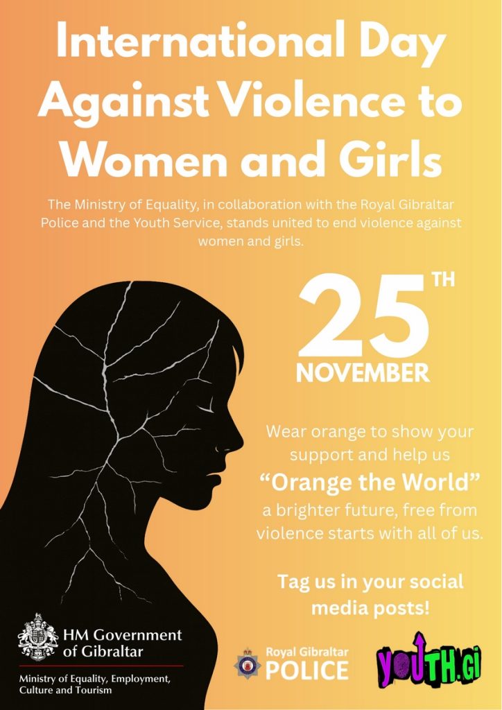 El Ministerio de Igualdad, Empleo, Cultura y Turismo –en colaboración con la Policía Real de Gibraltar (Royal Gibraltar Police, RGP) y el Servicio de Juventud (Youth Service)– celebrará el lunes 25 de noviembre el Día Internacional para la Eliminación de la Violencia contra las Mujeres y las Niñas.